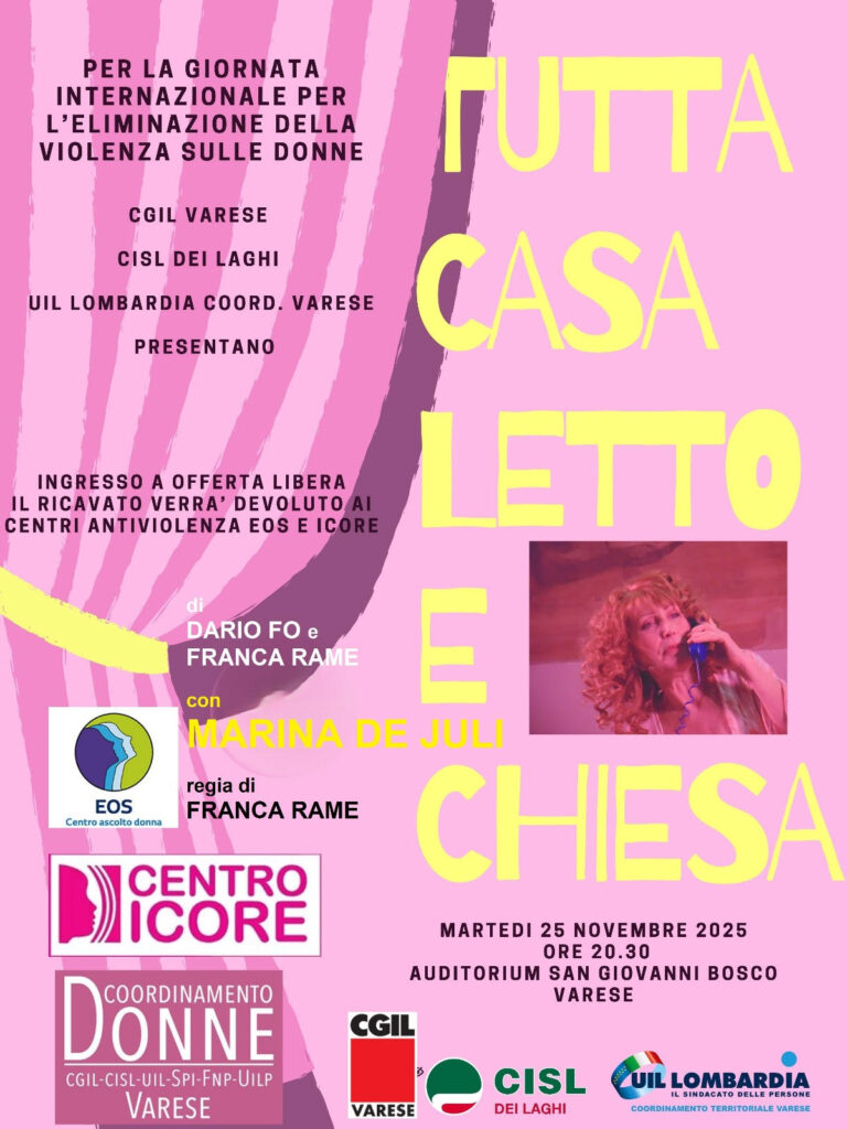 Per la giornata internazionale per l’eliminazione della violenza sulle donne CGIL Varese, CISL del Laghi, UIL Lombardia Coord presentano Tutta casa, letto e chiesa di Franca Rame e Dario Fo, con Marina De Juli all’Auditorium San Giovanni Bosco alle ore 20,30