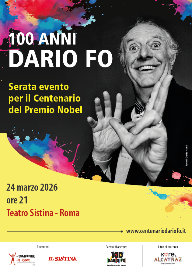 La giornata centrale delle celebrazioni sarà il 24 marzo 2026, data di apertura ufficiale del Centenario. Al mattino è previsto un evento istituzionale presso il Ministero della Cultura, dedicato all’eredità artistica, culturale e civile di Dario Fo. In serata, sempre a Roma, si terrà una grande Serata Omaggio al Teatro Sistina, con la partecipazione di artisti e amici che si alterneranno sul palco per un racconto collettivo fatto di letture, ricordi, musica e teatro.