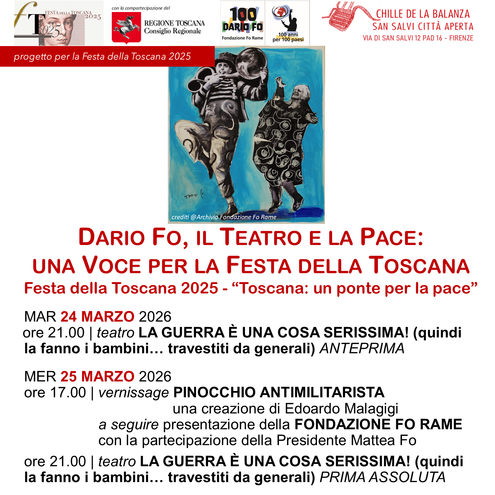 Il 28 marzo le celebrazioni approderanno a Milano con un evento di apertura alla Camera del Lavoro Milano – Salone Vittorio. Una serata promossa da CGIL Milano, Associazione Secondo Maggio e Fondazione Fo Rame ETS, concepita come un concerto-spettacolo inedito che intreccia canzoni, teatro e diritti, ripercorrendo l’opera di Dario Fo e Franca Rame e un secolo di storia culturale e civile italiana. L’idea e il coordinamento artistico sono di Alessio Lega, con la partecipazione di Giulia Mei, Giulia Angeloni, Mattea Fo, Piero Sciotto e altri ospiti.